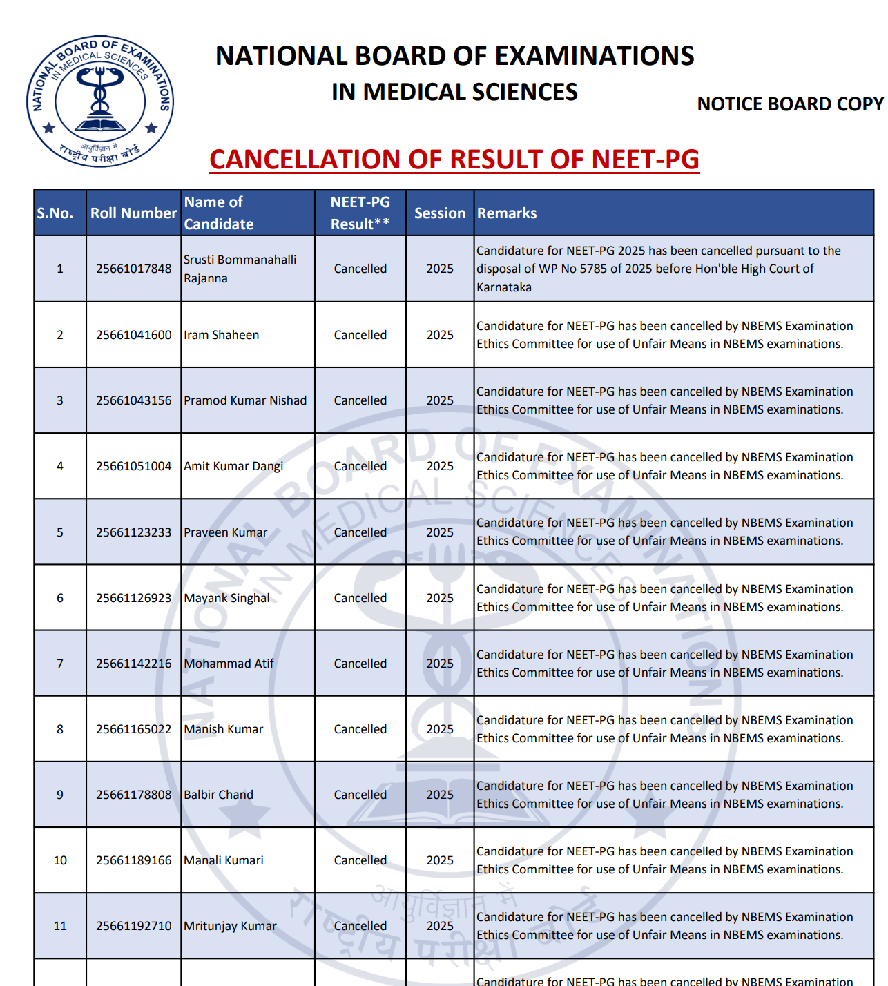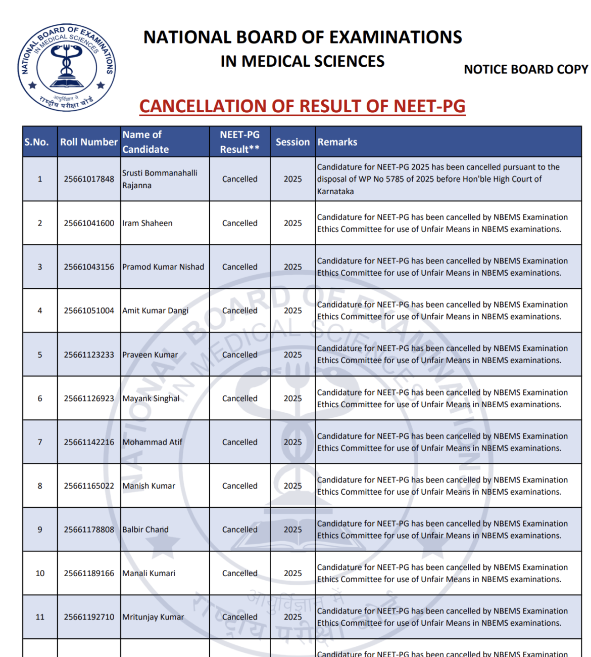 The National Board of Examinations in Medical Sciences (NBEMS) has cancelled NEET PG results of 22 candidates (2021-2025) for malpractice, including 13 from 2025. Additionally, 11 FMGE aspirants faced disqualification. NBEMS emphasized that using cancelled results for admission, employment, or registration is unlawful. The move underscores the board’s commitment to exam integrity amid rising scrutiny over transparency.