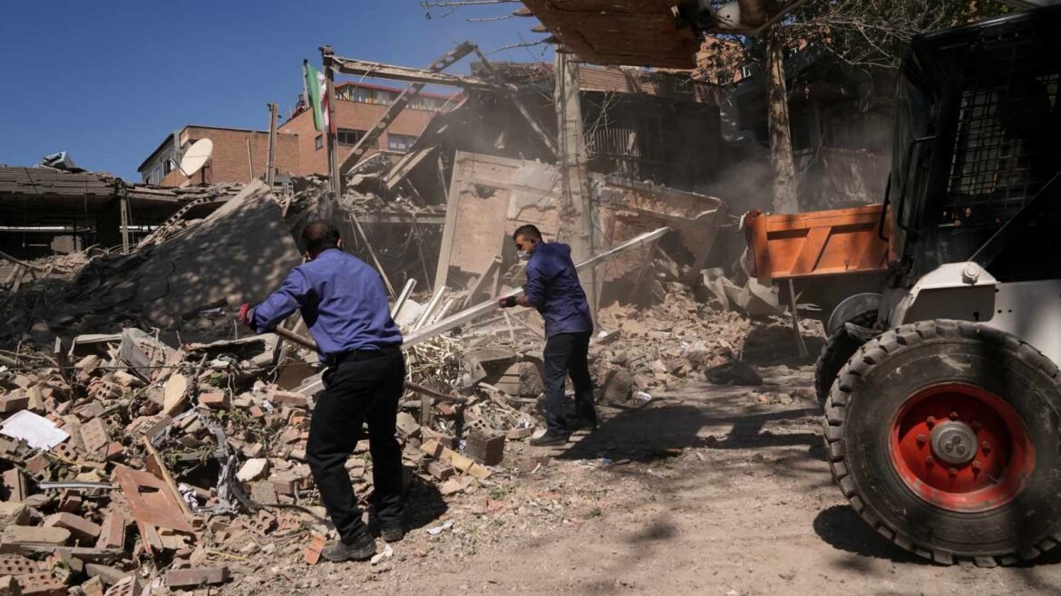 Workers remove debris at Tehran’s Sharif University of Technology complex that Iranian authorities say was hit by a US-Israeli strike, in Tehran (AP Photo)