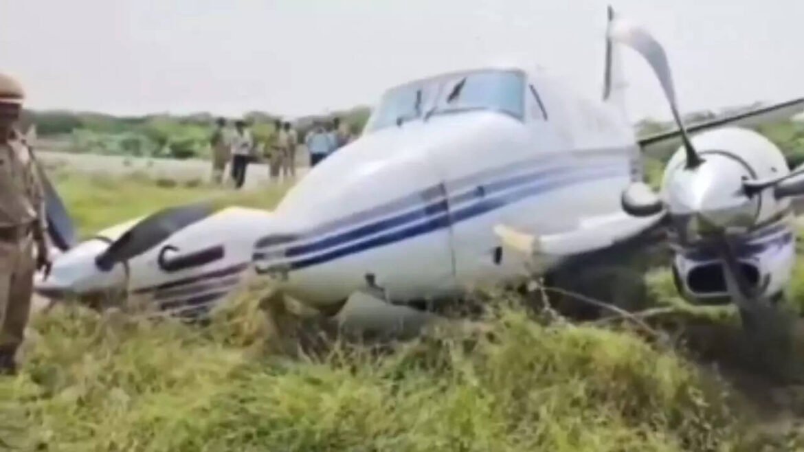 A private plane experienced a loss of control during takeoff in Farrukhabad, subsequently crashing into nearby bushes. Officials confirmed that both pilots and any passengers aboard emerged unharmed from the incident. Visuals from the scene indicate surprisingly minor damage to the aircraft, with its wings and propeller appearing intact, though the front of the jet is noticeably angled downwards.
