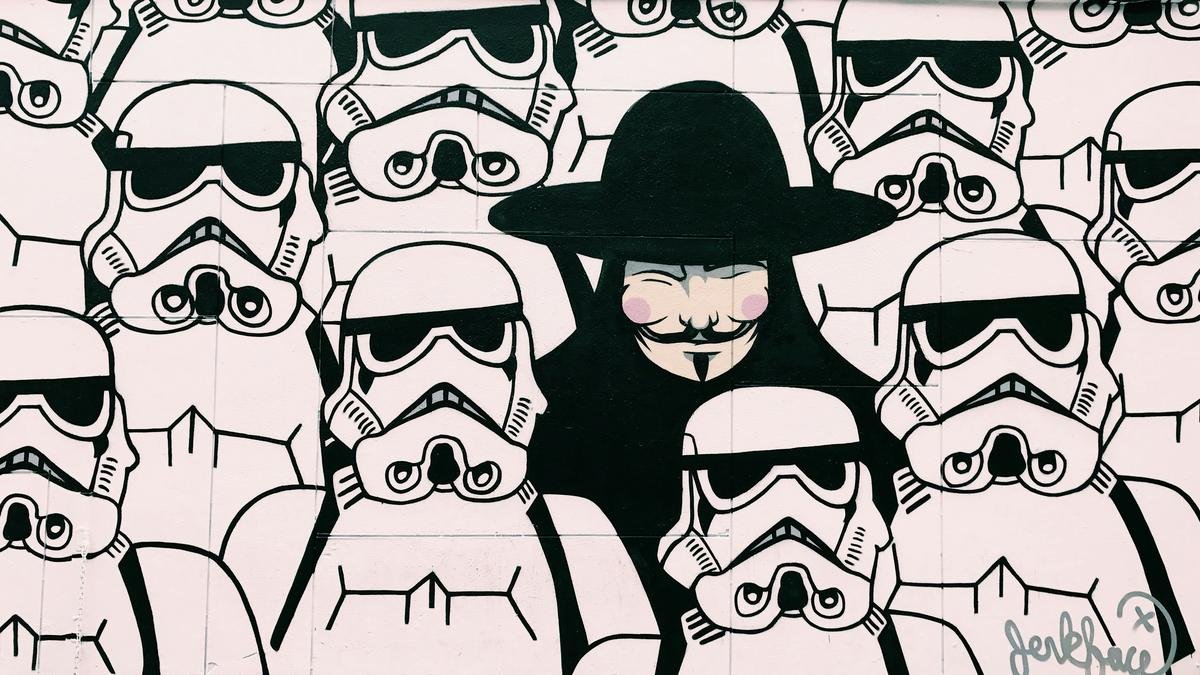 Take a look at the interesting picture on top which borrows two iconic characters from two iconic films — V for Vendetta and Star Wars. There is one ‘odd’ guy out there among the loyal crowd of stormtroopers (stormtroopers are loyal, enforcers to their fictional dictatorial government, the Empire). That is V, the masked vigilante who, in his filmic world, seeks to inspire rebellion against his fictional dictatorial government, Norsefire. Visually, when we look at this picture, the figure of the smiling V (his smile feels to us as if he’s mocking the authority that controls the others) stands out to us, yet, all of the people in the picture are masked characters.